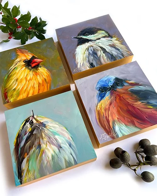 Whether your favorite is Eleanor who is the queen of pot luck, hates that she’s clumsy and loves to knit, or sweet Midge who is a day dreamer, has a soft spot for homeless animals and is cute as a button, you can find your favorite one of the “birds of a feather” collection of 16 original bird oil paintings!